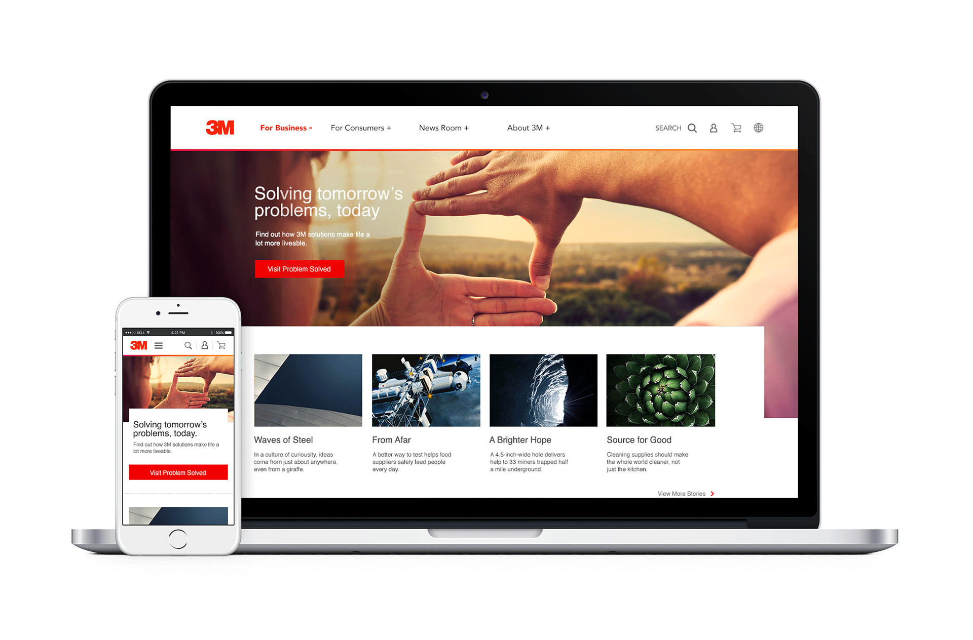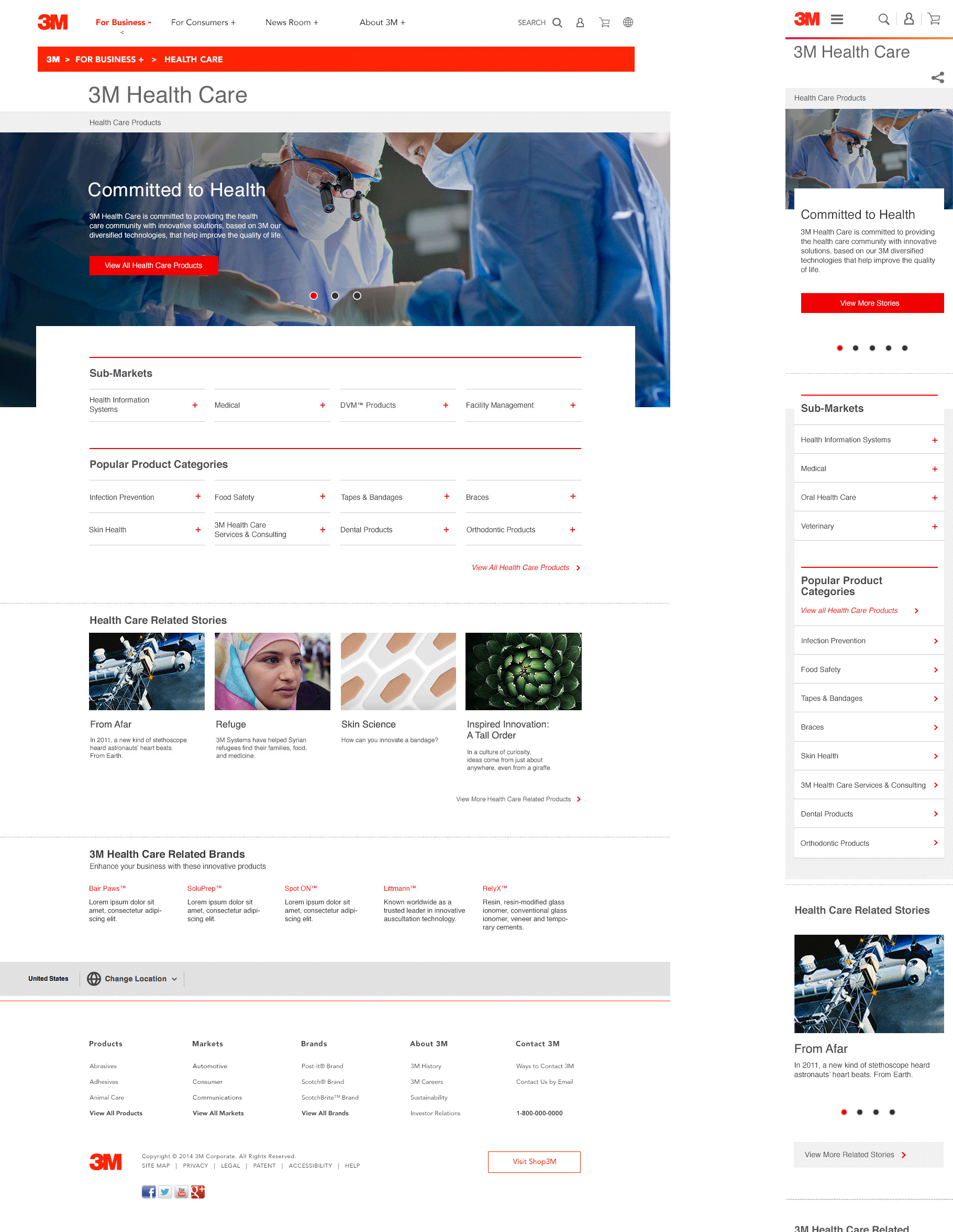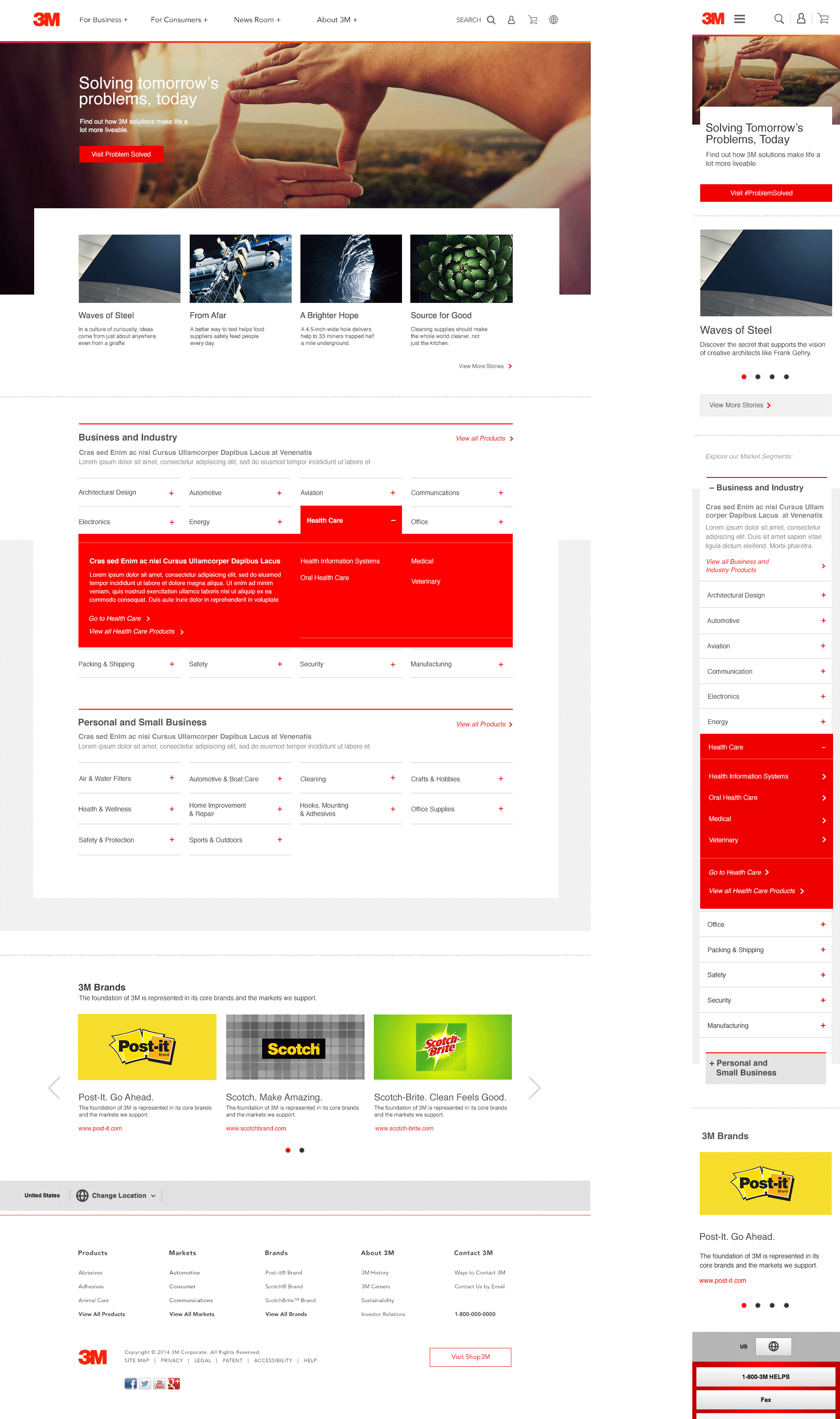 Homepage (with industry navigation open) Site is a component-based architecture. Designed to help you quickly navigate to industry or brand categories while allowing space for 3M to tell their innovation stories and show how 3M is changing lives through science.