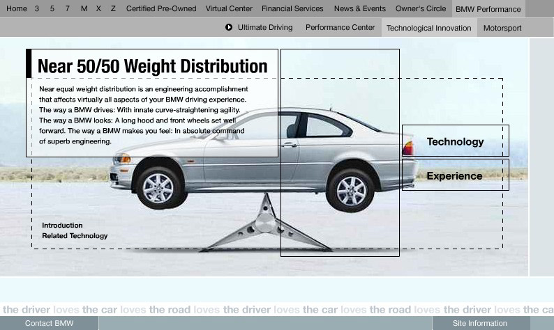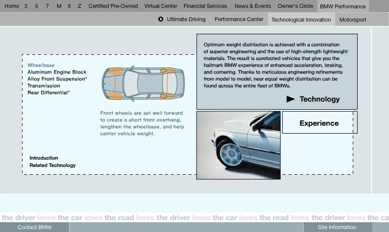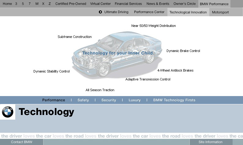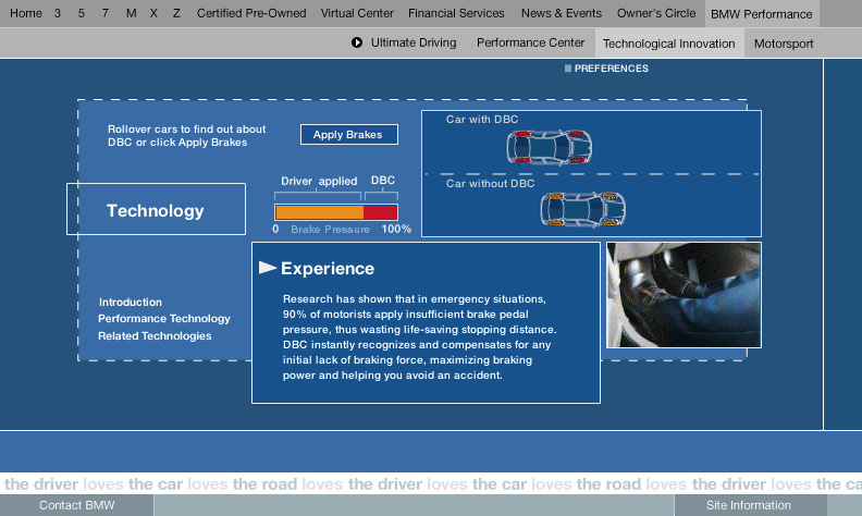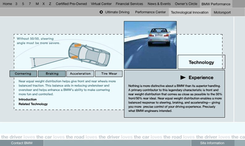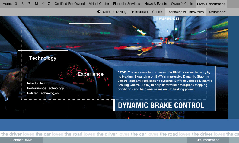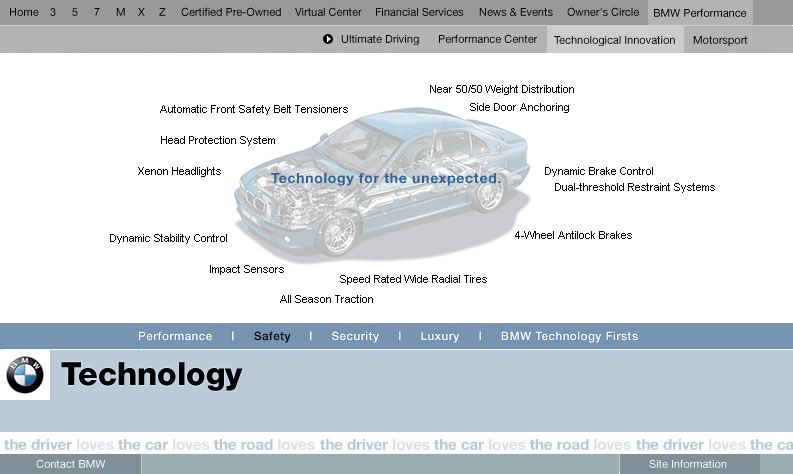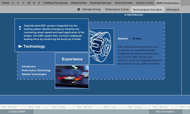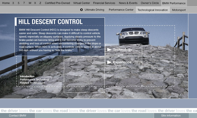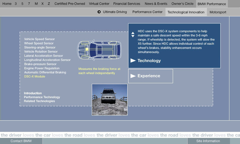 An engaging section of bmwusa.com featuring a series of groundbreaking online experiences promoting BMW's commitment to technology and innovation with emphasis placed on active safety. These were among the first full-screen shockwave /flash pieces on the web. Each experience incorporated videos and interactive animations which showed the technology in action. Each of these experiences were linked from multiple places on the site. Buttons in the lower left of the experience were all dynamically generated and allowed you to get back to the exact page you came from. Experiences were launched for All Season Traction, Dynamic Stability Control, 50/50 weight distribution, Antilock Brake Systems, Dynamic Brake Control, Mayday Phone, GPS Navigation, Hill Descent Control, and Head Protection System. For Duffy Design 1999-2000