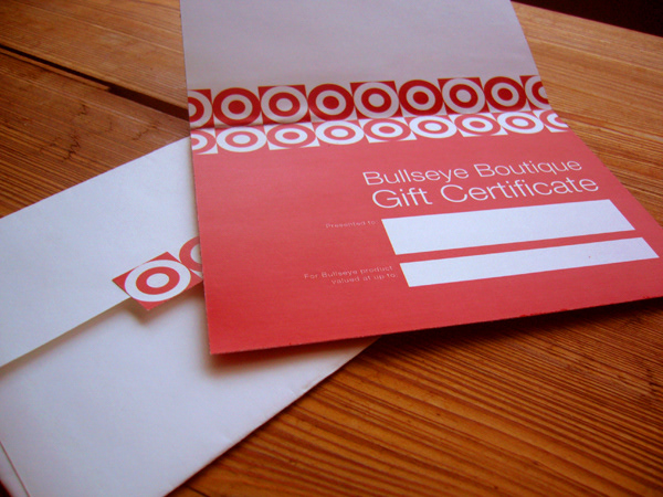 Employee Gift Certificate for the Bullseye Boutique, brand retail shop.