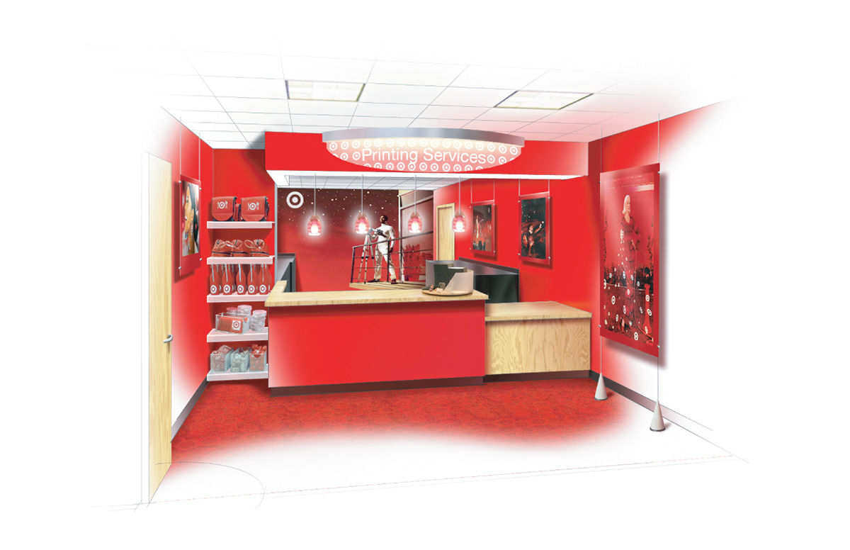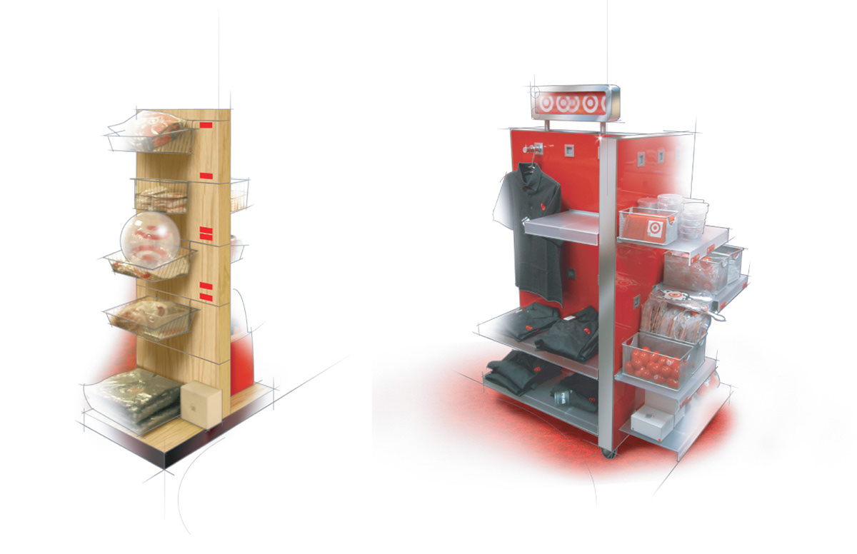 Custom shelving for the Bullseye Boutique brand retail space at Target headquarters.