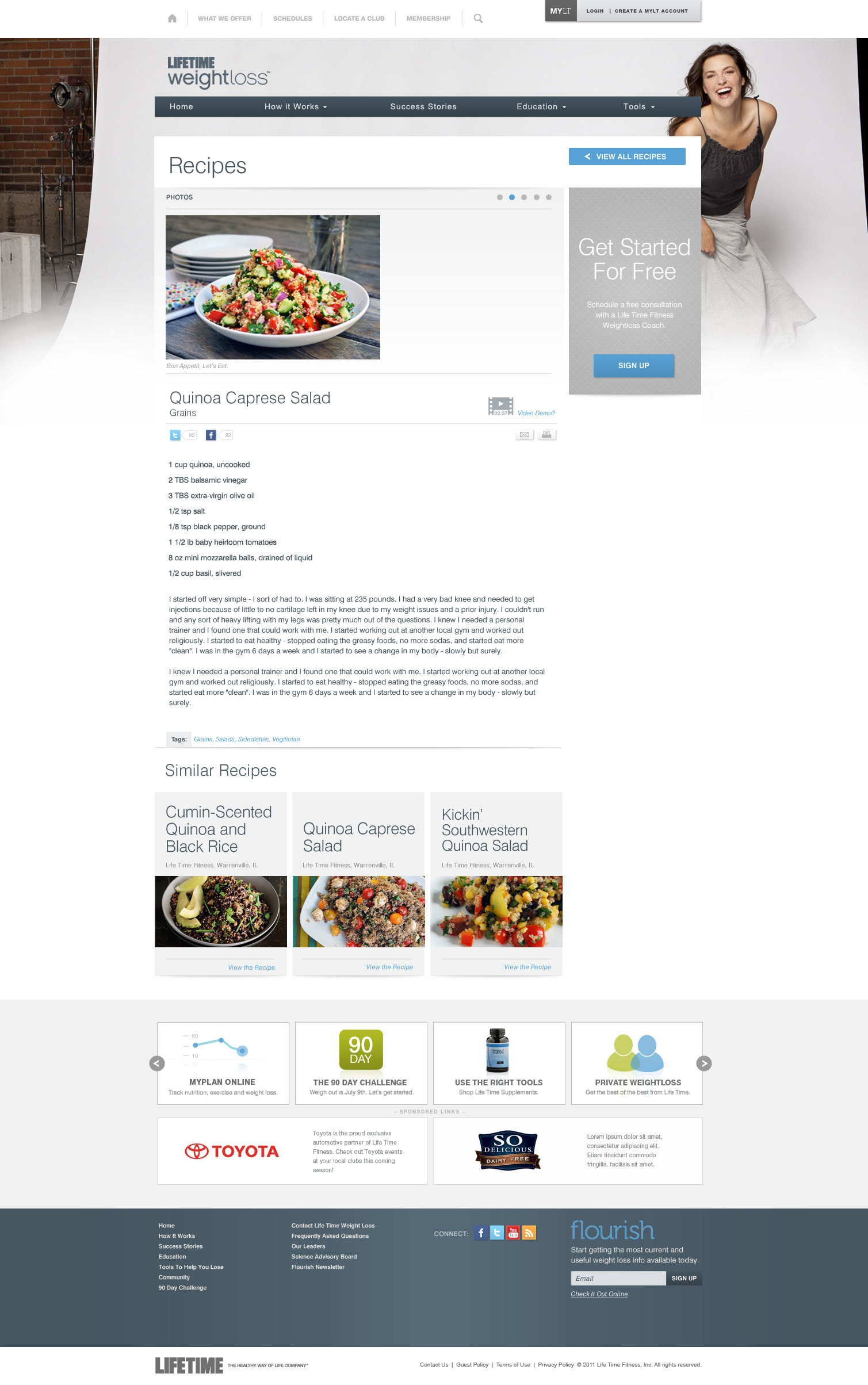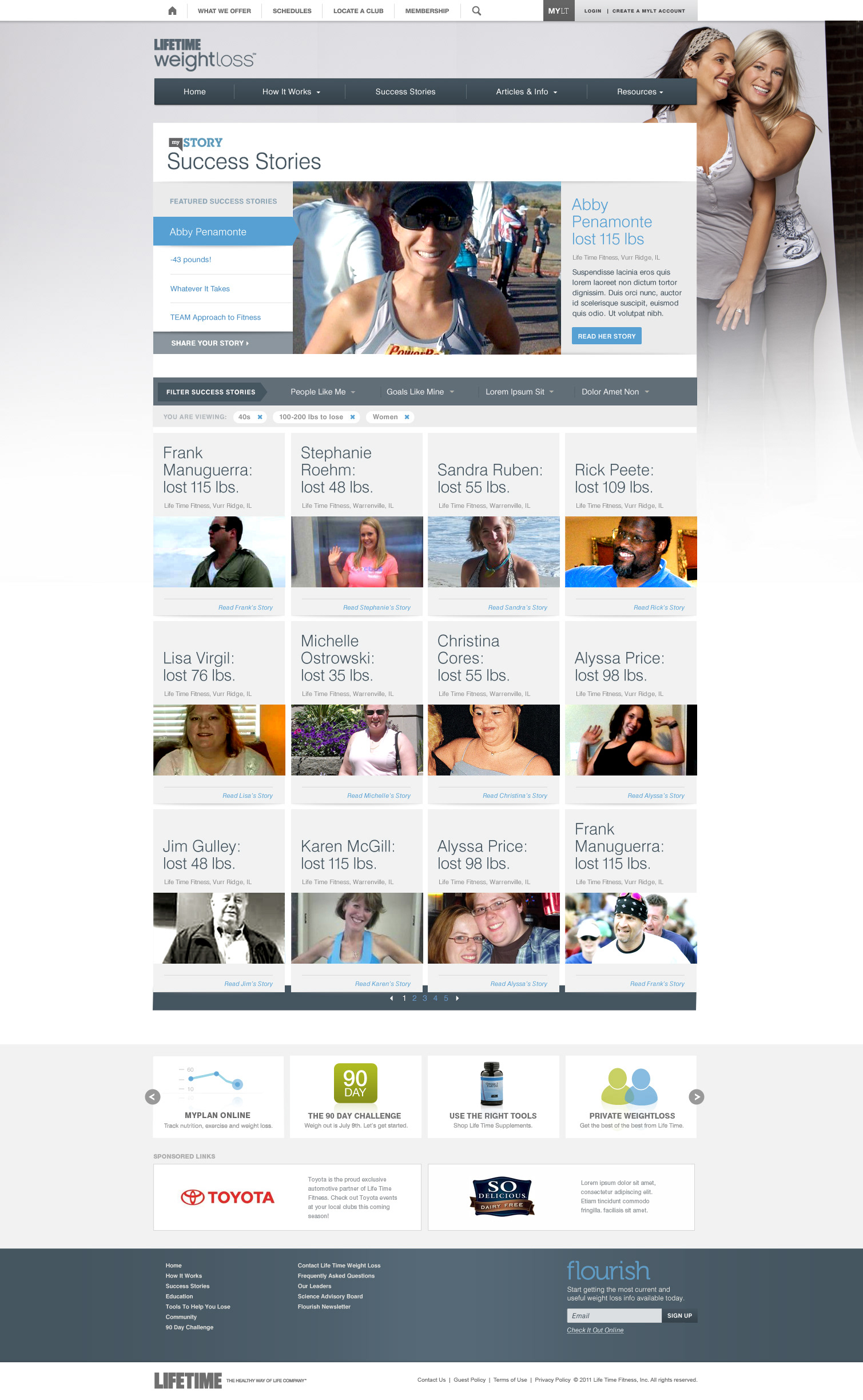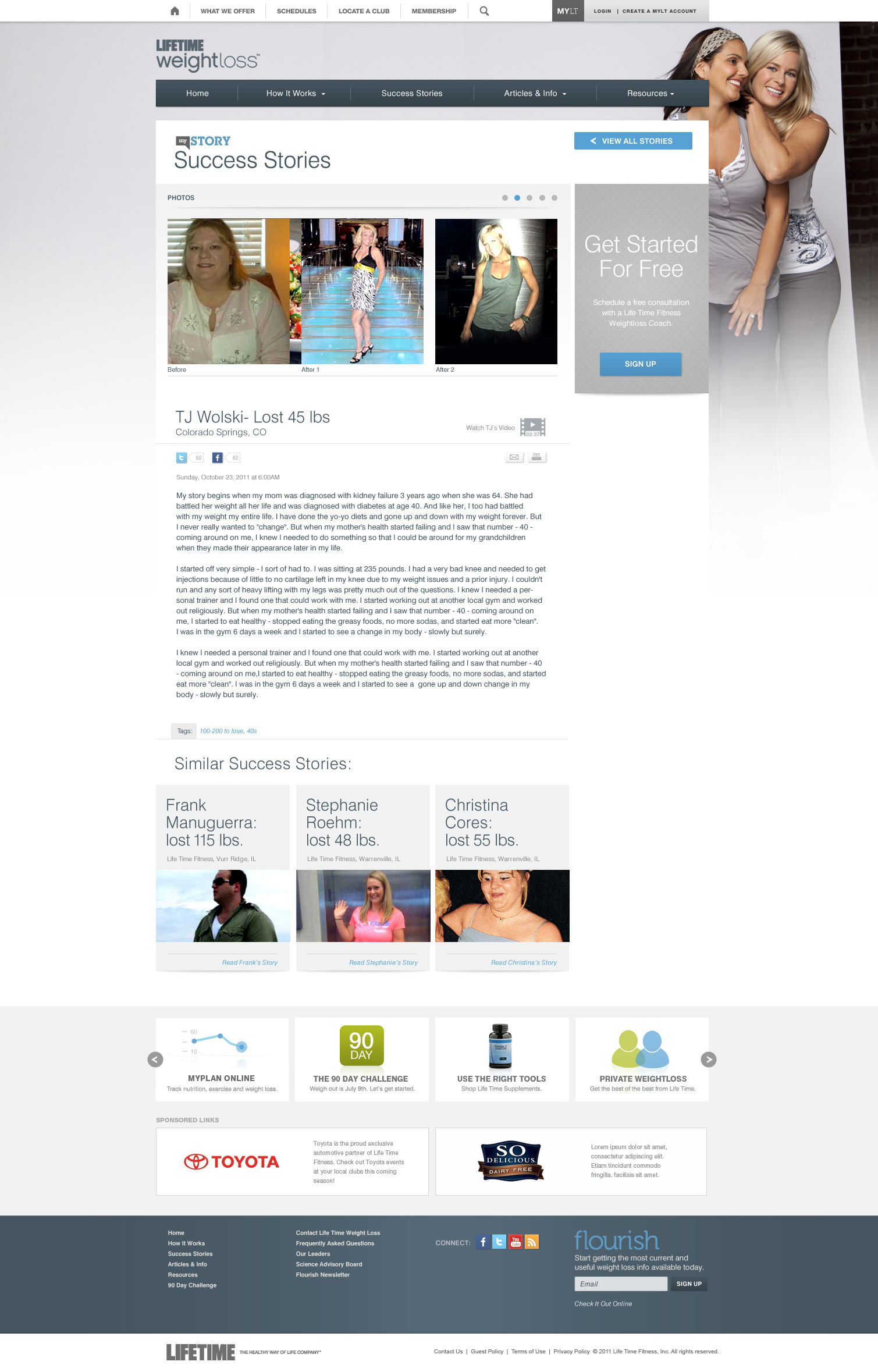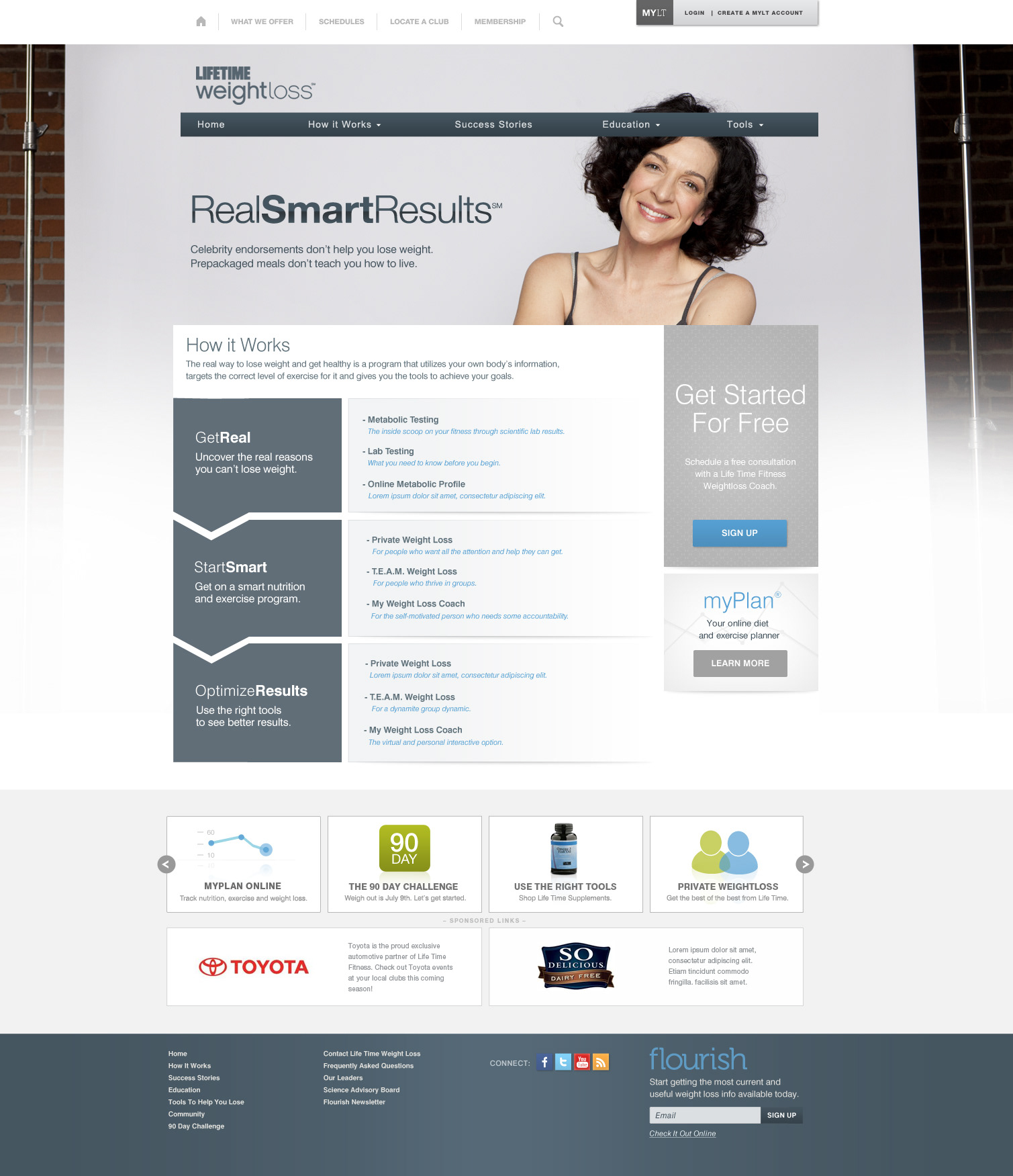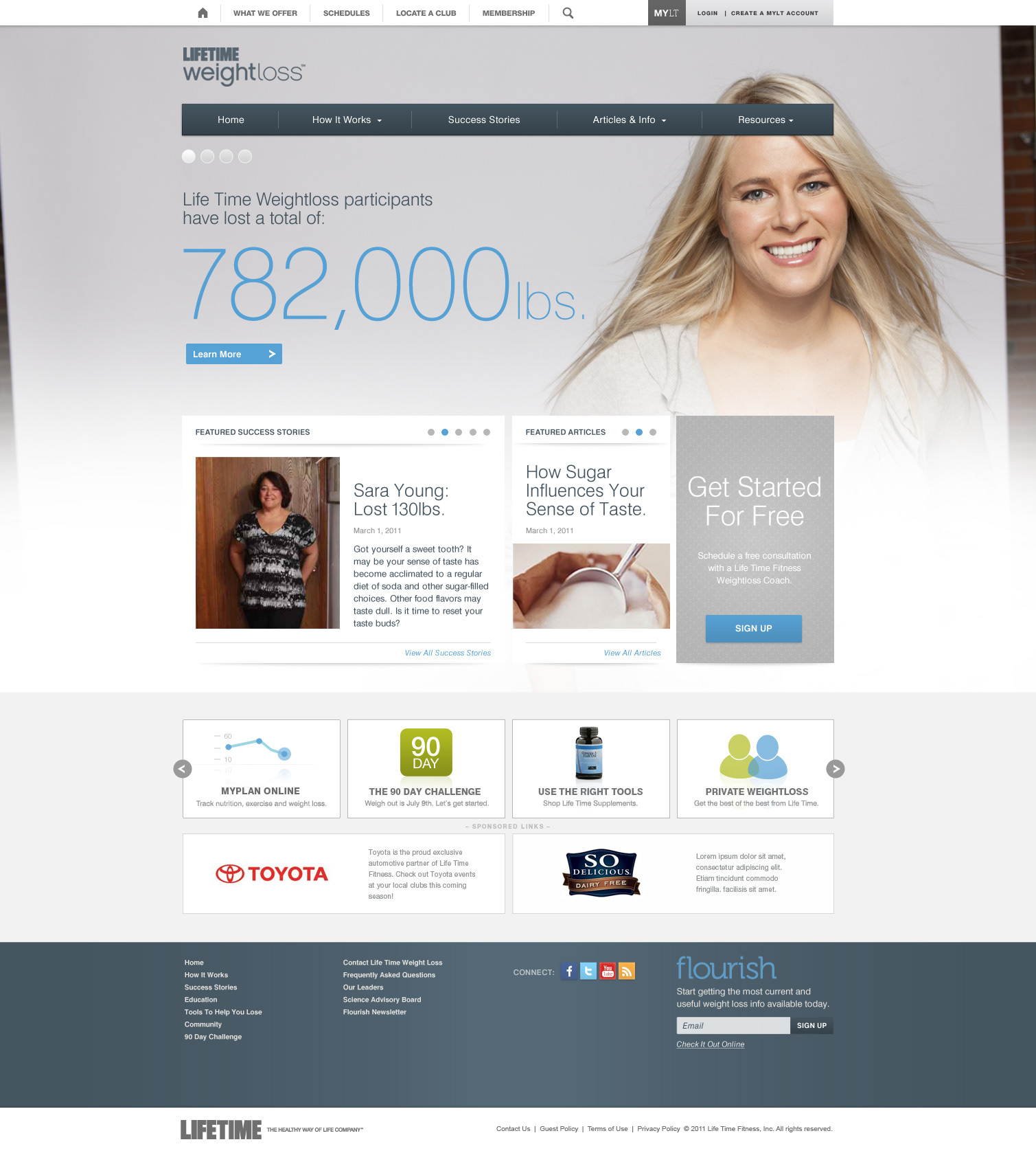 LifeTime Fitness redesigned their website not only to have a modern, premium feel consistent with the new LifeTime Fitness brand, but also to increase usability. I designed page templates for use across Lifetime Fitness’ 20 companies inside using the Weight Loss business segment. Requirements were to incorporate a number of changeable, database-fed modules to accommodate articles, recipes, weightloss stories, nutritional supplements, promotions, etc. All modules have a consistent height, but can be changed to span multiple columns for more important features and made to incorporate a multistory feature to add information density where needed. These modules can also be text only or incorporate images. Ample space was also given to feature the beautiful brand photography which was being shot for each business segment - such as running, swimming, nutrition, yoga, personal training, etc.