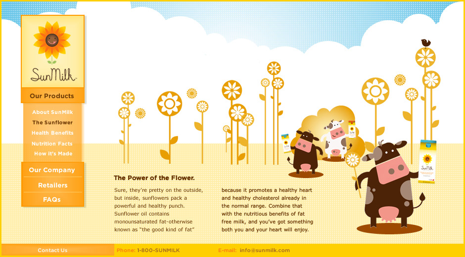 SunMilk was a new product launch featuring a heart-healthy product combining both milk and sunflowers. I worked with Fallon's advertising team to roll out their online brand presence which emphasized that it was a fun, natural product. My role include completing the site map, wireframes, art direction and design.