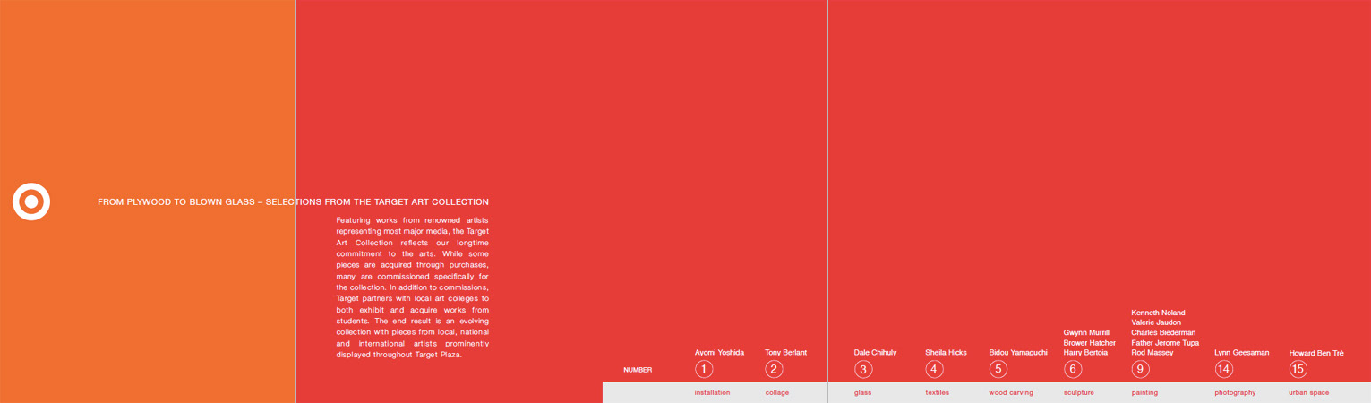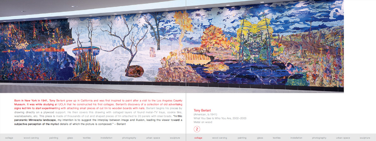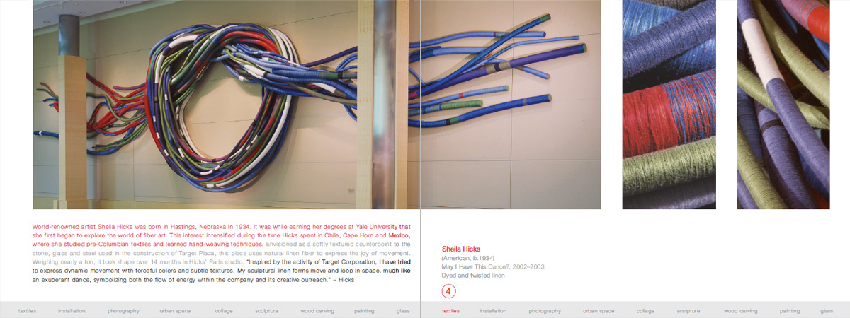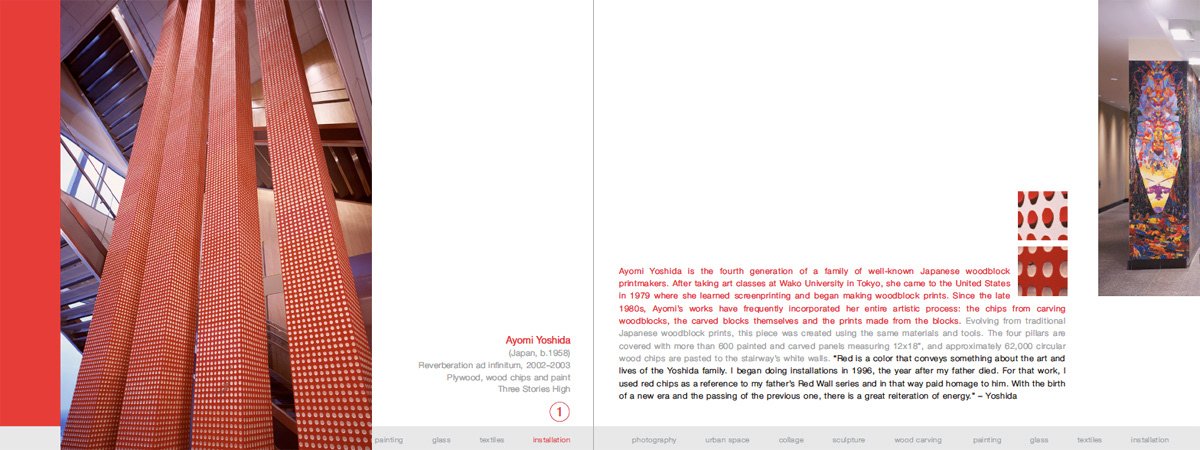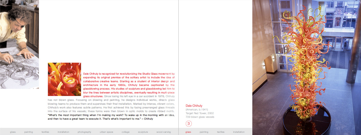 First spread. every work of art has corresponding detail photos. Red type talks about artist, gray type about the work and Black is an artist quote. The bar along the bottom edge is a list of media with the corresponding media type highlighted along with the artist and work info.