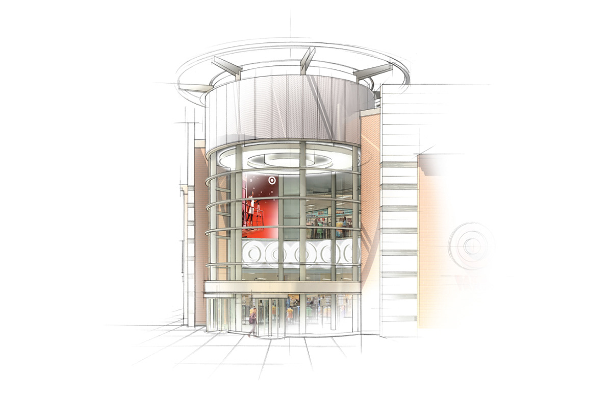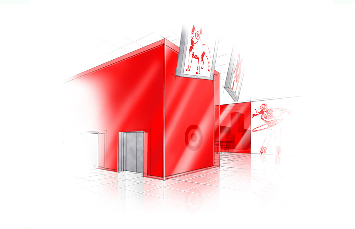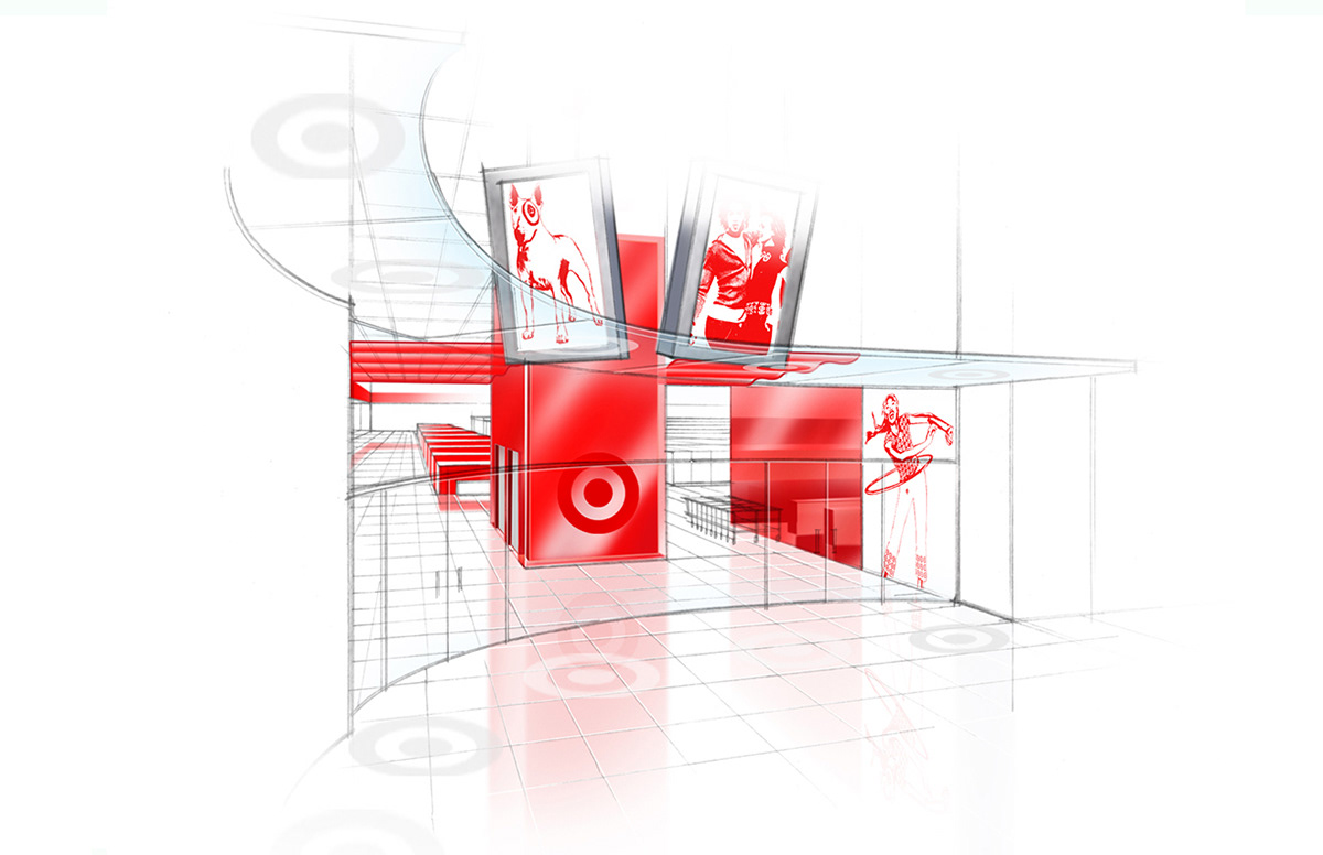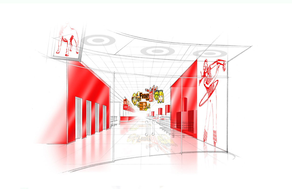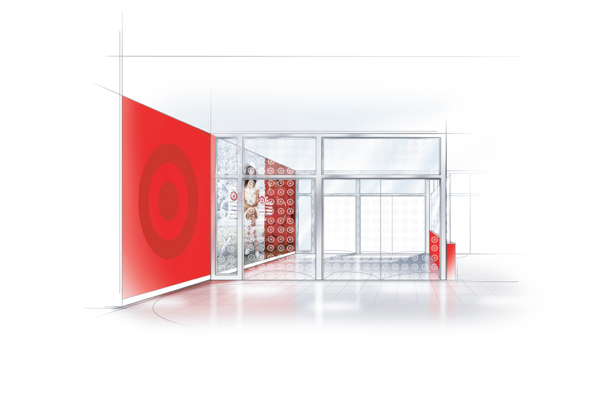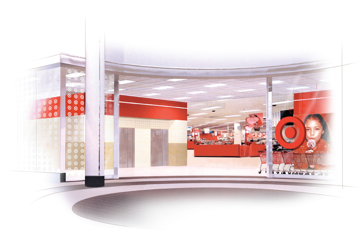 Chicago South Loop store entrance. Sculptural bullseye relief pattern, sculptural drop ceiling and large format hero brand image. are all touches which we added to the architectural plans.