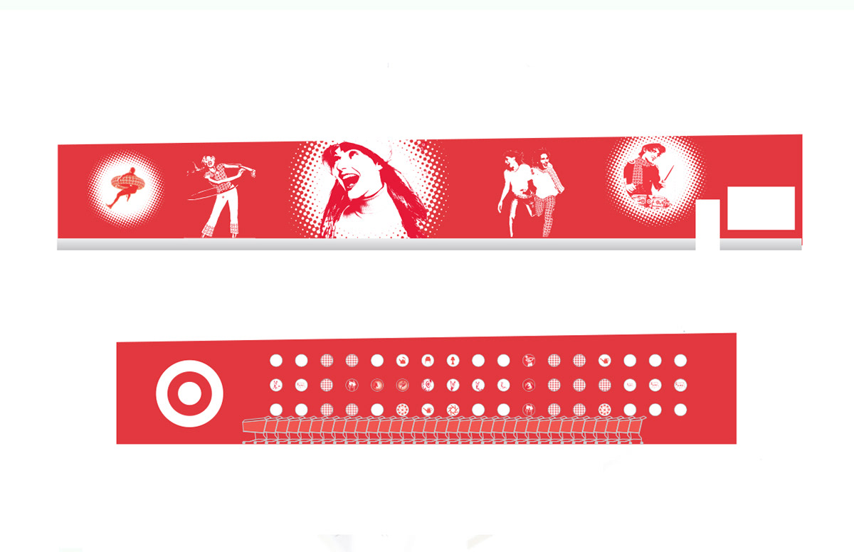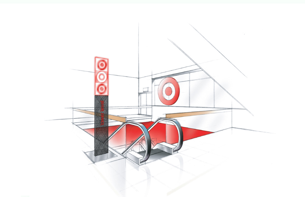 Downtown Minneapoils store entry. We added a lenticular bullseye pattern over the cafe windows and a largs bullseye in relief hangs on the glass wall. Depending on angle of view, the lenticular bullseyes appear either frosted or transparent. Seasonal brand imagery appears behind over the cartwell.