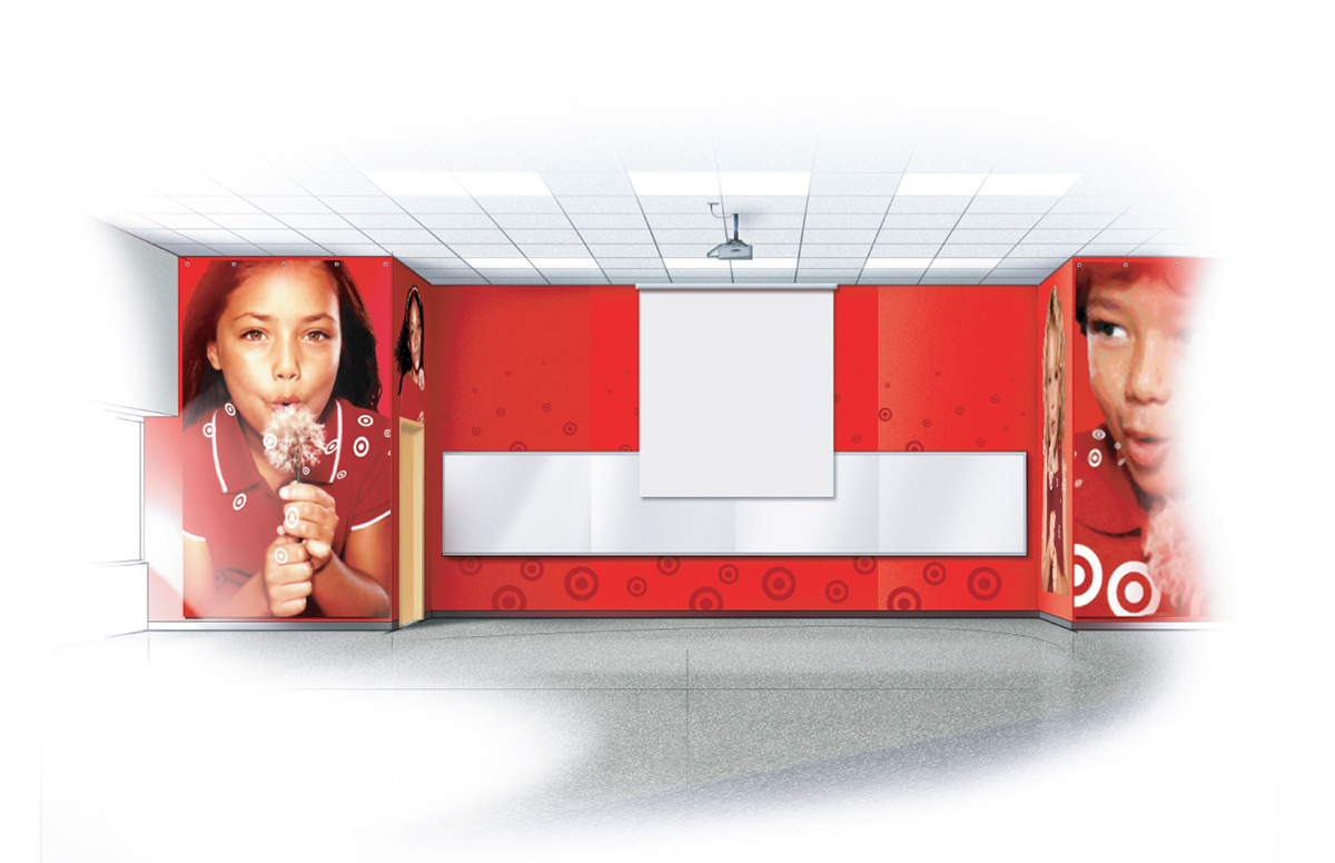 Target Main Training Classroom. Brand images are cut from billboards and hung at the front of the room
