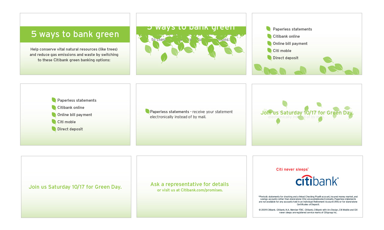 Citibank in-branch spot for John Ryan Company. In-branch spot highlighting online banking and paperless statements. Color bars and type dissolve into and are in turn revealed by leaves to transition between messages.